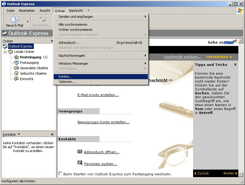 Öffnen Sie Outlook Express und wählen Sie den Menüpunkt Extras, Konten